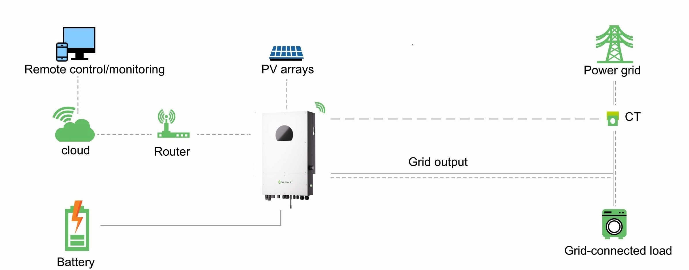 Hybrid AC/DC InverterThe Helios-6KLV-US split-phase hybrid inverter power management system is renowned for its versatility. It accepts a second input power source compatible with a generator and can be optionally equipped with an external current transformer (CT) sensor for 100% self-sufficiency. The inverter's built-in battery management system (BMS) communication port (RS485) ensures seamless integration with products from leading Chinese lithium-ion battery manufacturers, while user-adjustable charging current and voltage allow for personalized settings to optimize energy storage performance.