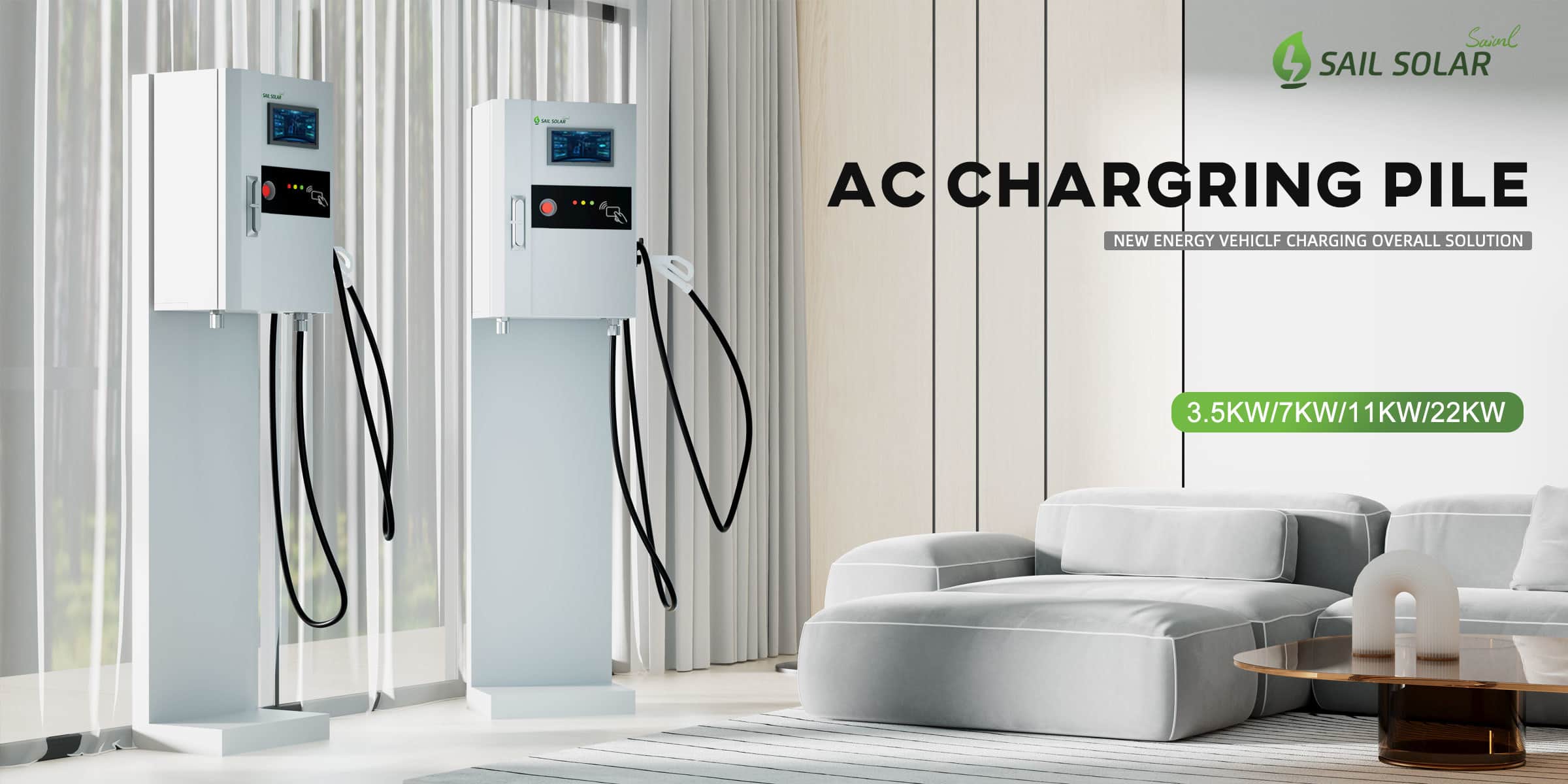 Sail Solar AC EV charger is mainly installed in home, community parking lot or factory, and provides various types of electric vehicles with different voltage levels through charging plugs. This type of charging pile is usually relatively small, with beautiful appearance design and flexible installation. It is suitable for family, parking lots, business areas and other places.