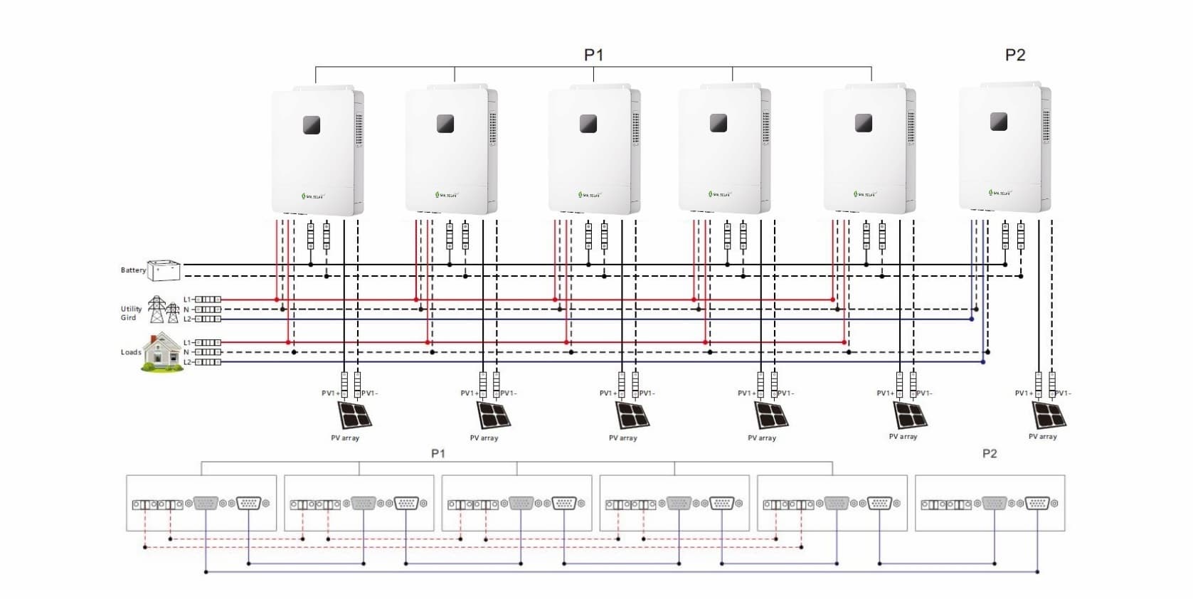 Solar inverter support up to 6 units in parallel connection,solar energy storage inverters can be connected in parallel to form two phases.