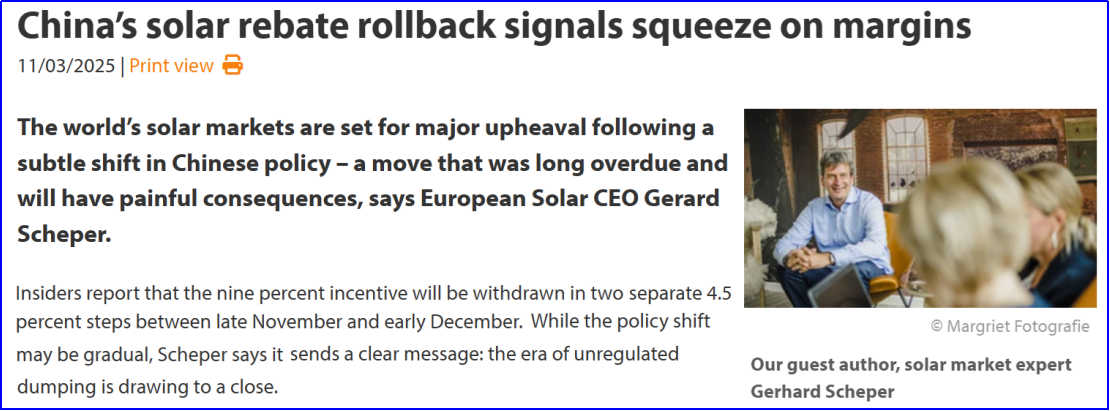 While the report claims this information comes from "insiders," a search of publicly available information by *Global PV* indicates that the latest policy regarding export tax rebates for PV products is still the one issued on November 15, 2024, by the Ministry of Finance and the State Administration of Taxation, which states that "the export tax rebate rate for photovoltaic products and batteries... will be reduced from 13% to 9%," effective from December 2024.