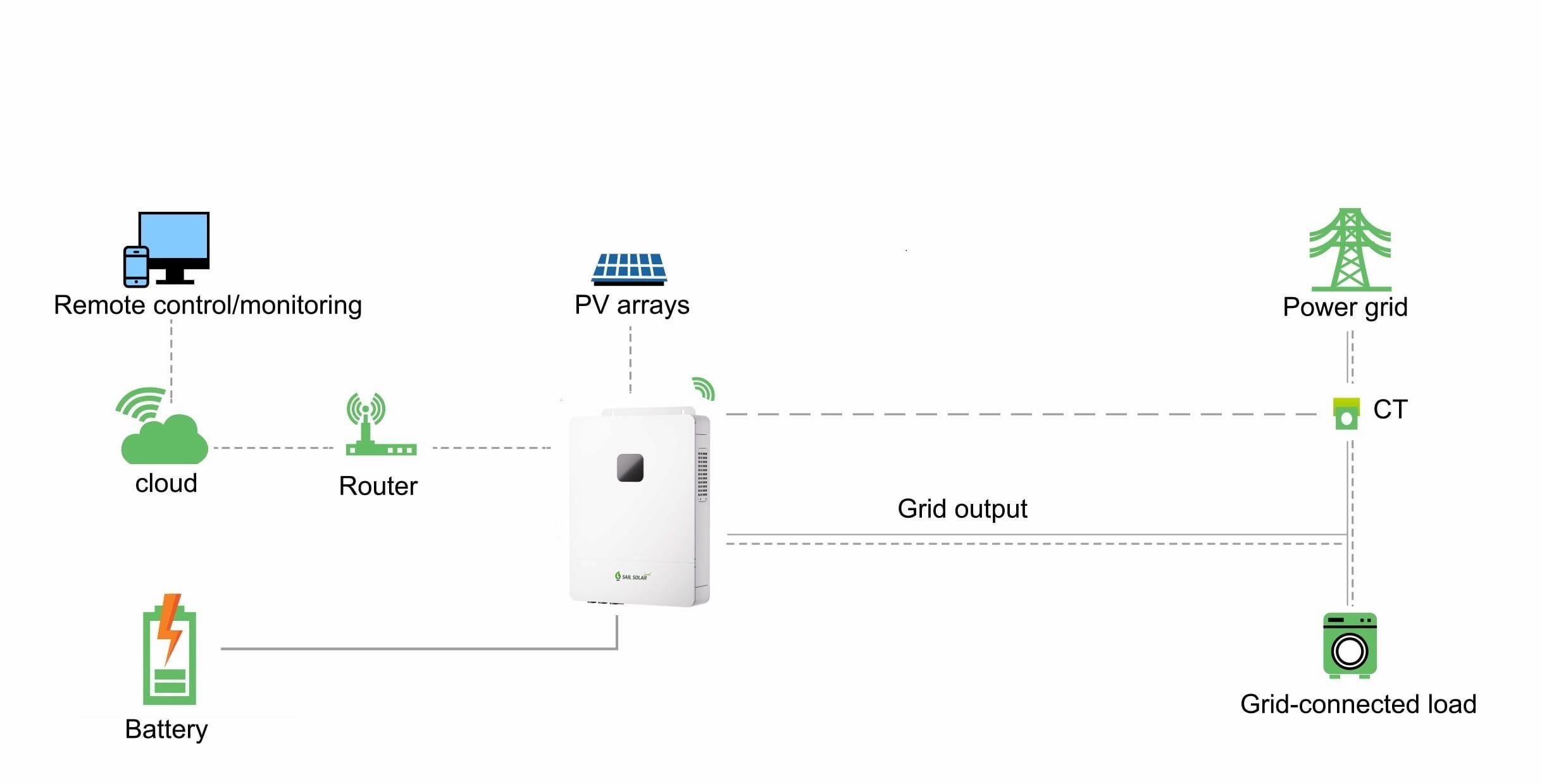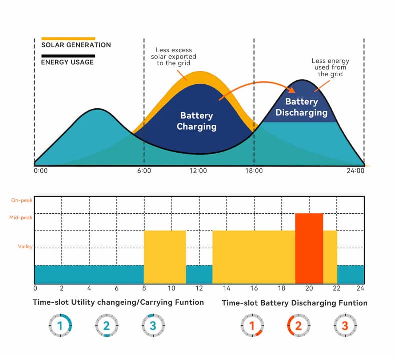 This solar inverter has the timed power charge/discharge function. Users can set different charge and discharge periods according to the local time-of-use price, thus reasonably using mains and PV power. When mains is expensive, the battery inverter is used to supply power to the load; when mains is cheap, it can be used to supply power to and charge the load, thus helping users reduce electricity expenses to the full extent.