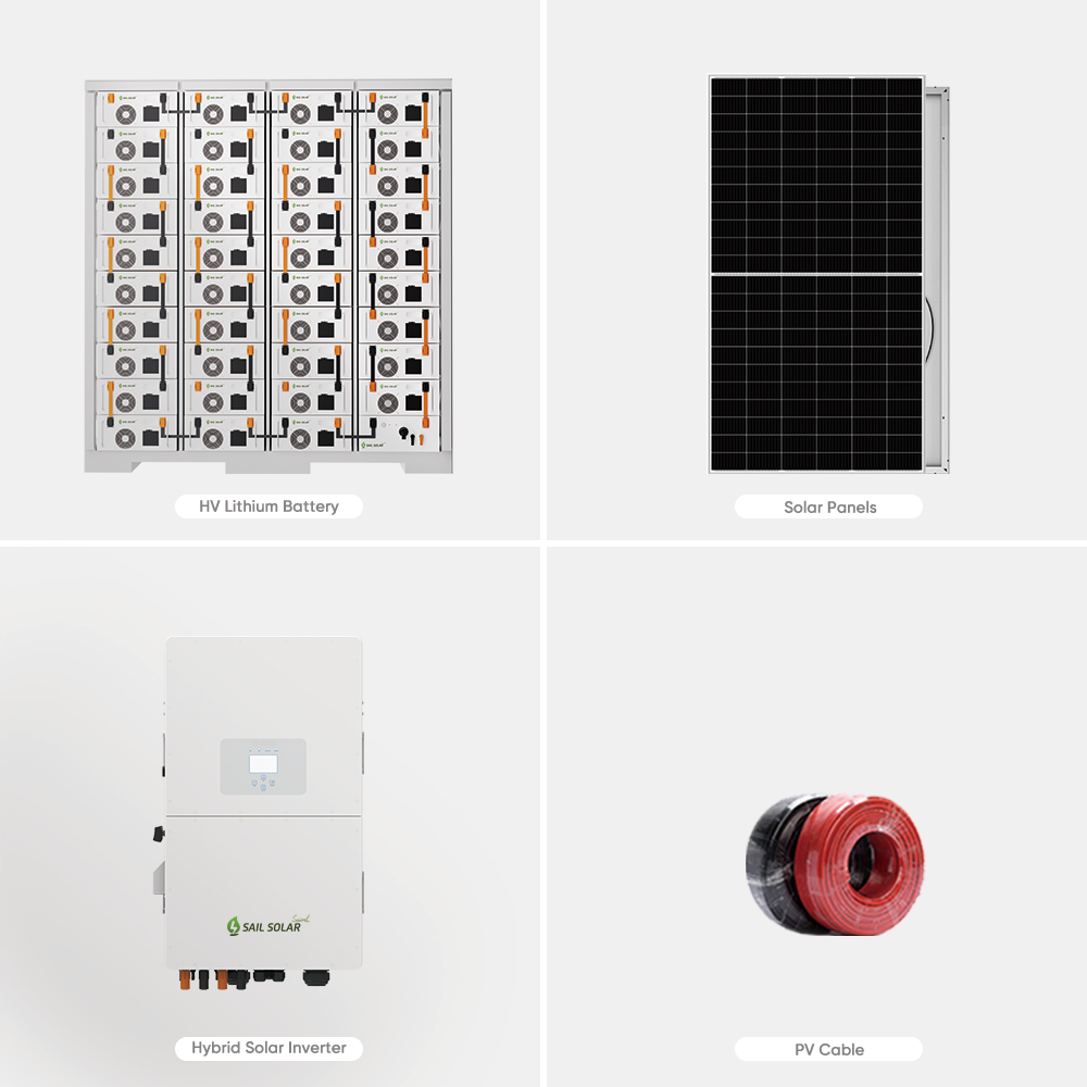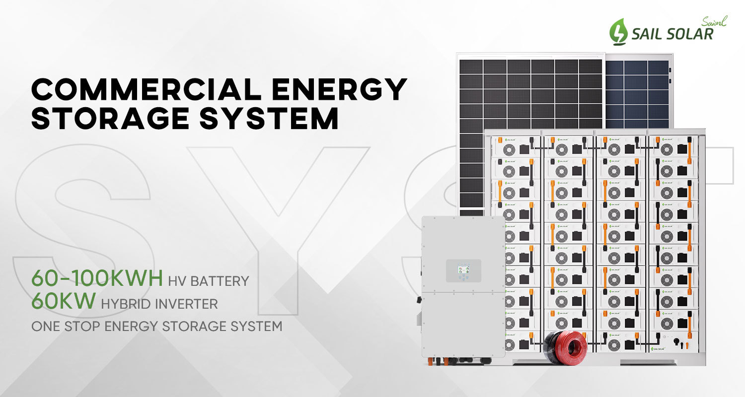 Sail Solar 60kw hybrid with 60~100kwh high voltage lithium battery solar power system. This system size is best suited for commercial facilities, large agricultural operations, or estate homes with consistent, high energy demands. With a properly designed grid-tied or hybrid system, you can also take advantage of net metering, sending excess energy back to the utility grid to earn credits and lower your future electric bills.