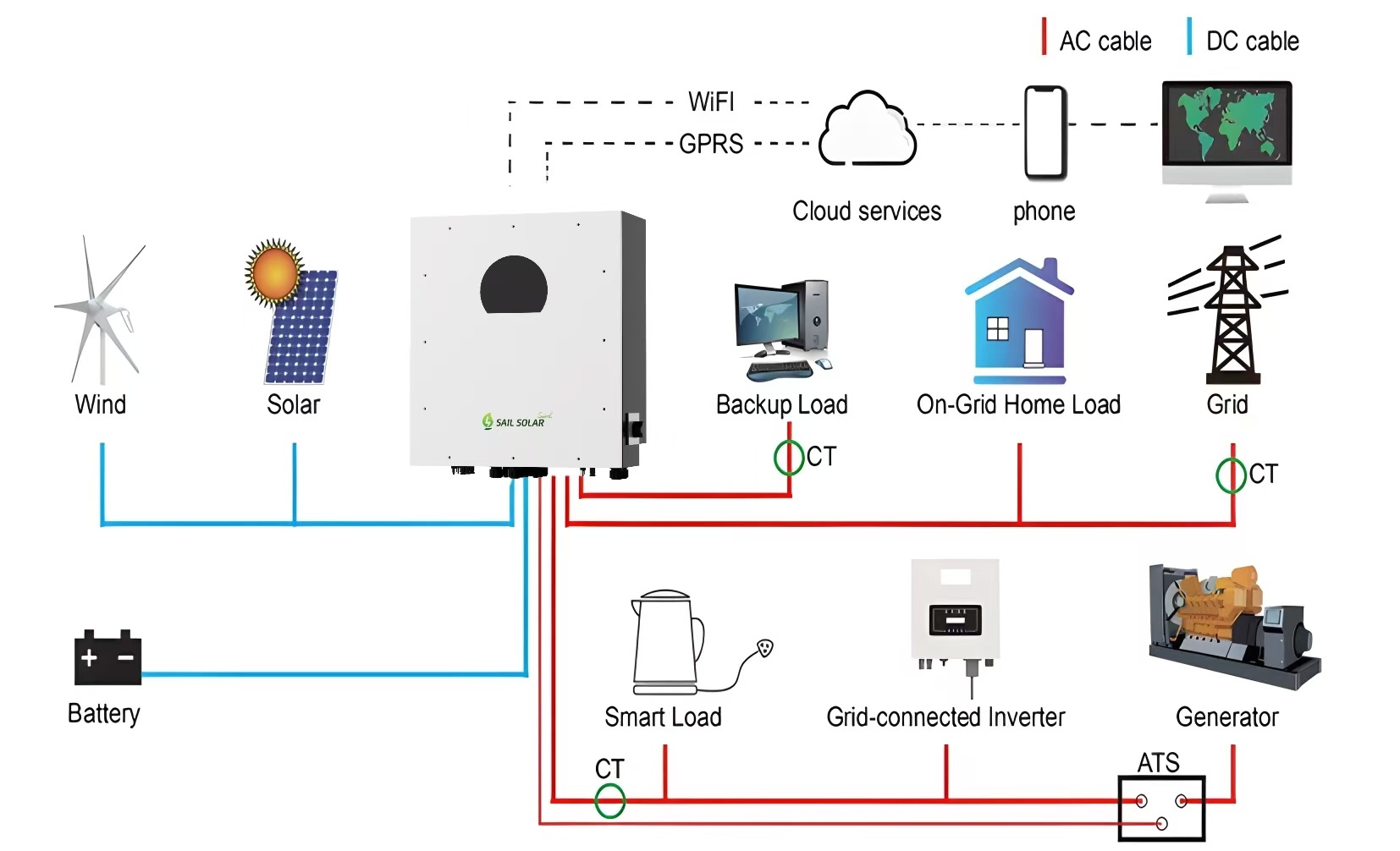 The Sail Solar 25kW Inverter is an all-in-one solution that comes with everything you need for quick and efficient installation. Thoughtfully and securely packaged, it ensures all components arrive intact and ready for use, making the setup process seamless and hassle-free. At the heart of the system is the Helios Series 25kW 480V Hybrid Solar Inverter, a cutting-edge device equipped with a vibrant colored LCD display for easy monitoring and operation. Designed to meet modern energy management needs, it features multiple communication functions, allowing users to effortlessly monitor and control the system through a dedicated mobile phone app. Whether at home or on the go, remote operation ensures maximum convenience and flexibility.