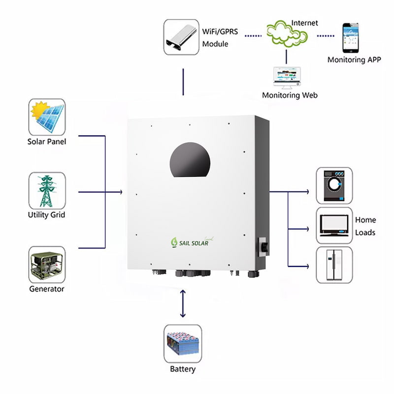 The Sail Solar 50kW three-phase hybrid inverter features industrial-grade intelligence and built-in WiFi for remote monitoring and control, optimizing energy management in commercial solar system applications.