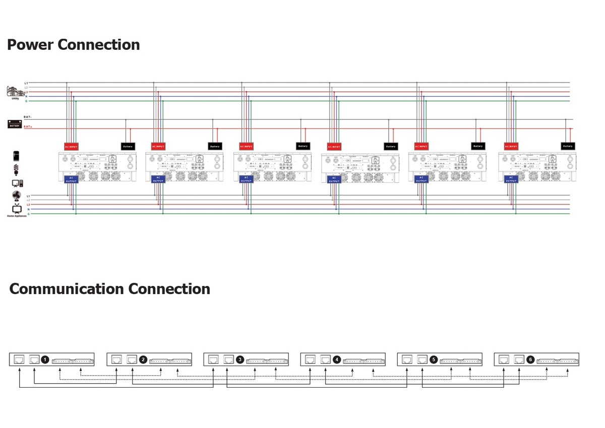 Helios-12KLP3-EU hybrid solar inverter can support max 6pcs in Parallel, with paralleling inverters allows you to achieve higher total power output, which is essential for high-power loads. Whether you are running heavy machinery or powering large commercial spaces, the combined output of multiple inverters ensures that your energy needs are met without compromise.